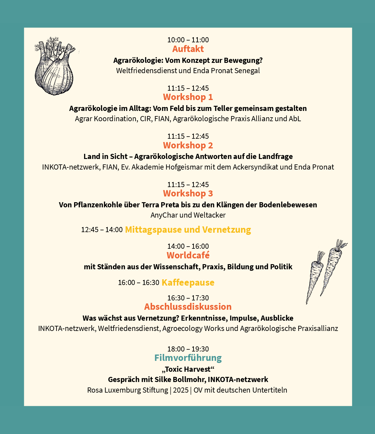 Freuen Sie sich auf interaktive Workshops, inspirierende Begegnungen und frische Impulse – für alle, die sich für gerechte und nachhaltige Ernährungssysteme engagieren.